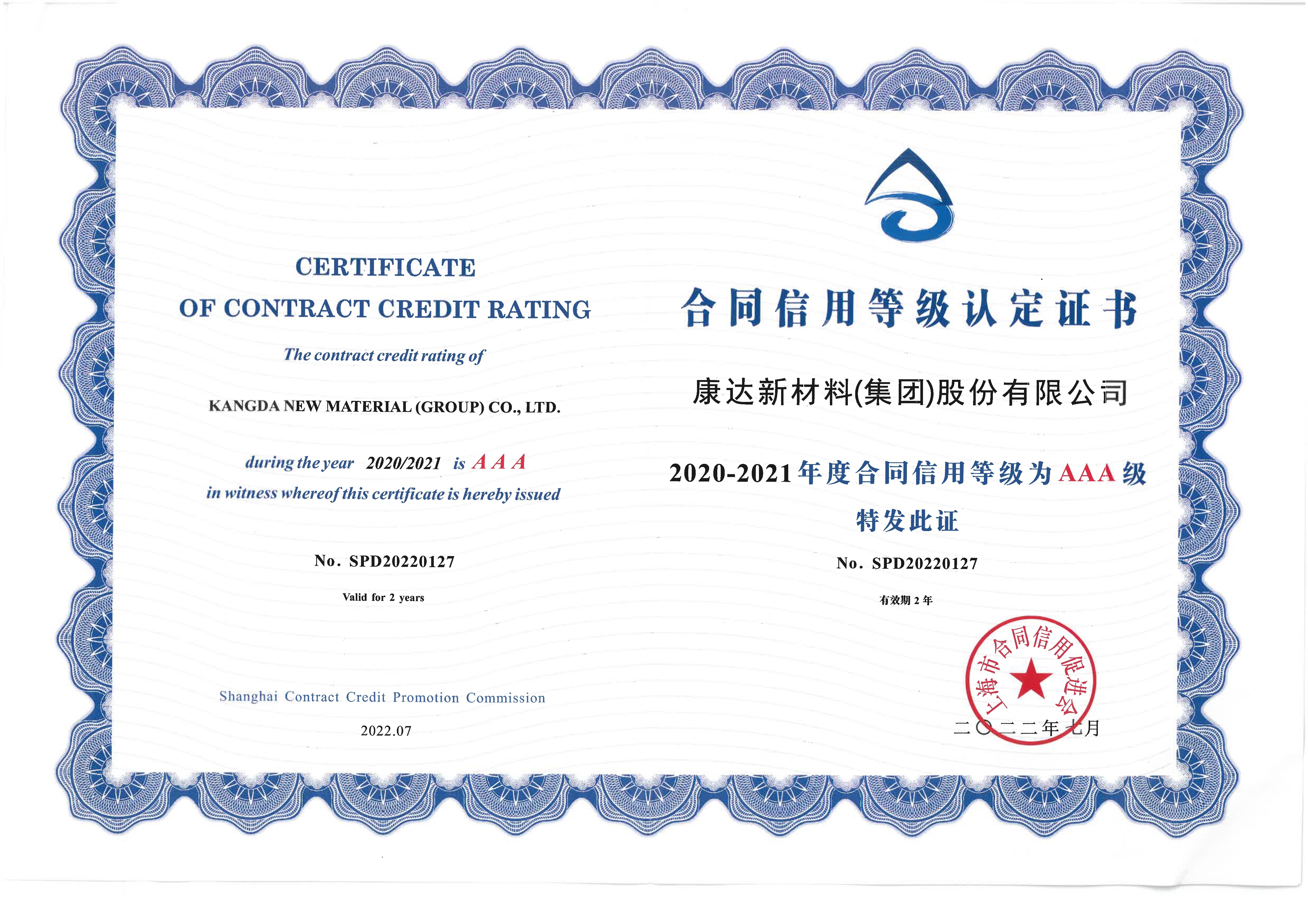 康達新材料(集團)股份有限公司榜上有名,再次榮獲“上海市2020-2021年度守合同重信用企業”稱號,并榮獲AAA級合同信用等級認定